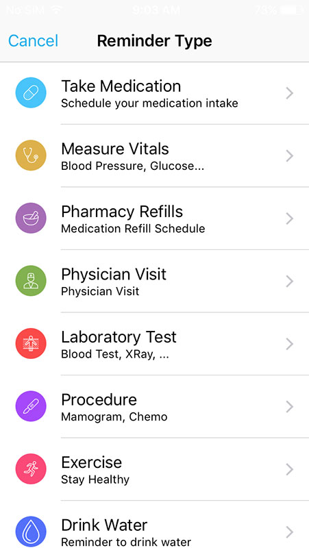 In Care Plan section, users can setup the reminders for various activities, including taking medications, measure vitals, prescription refills, physician visits, drinking water, and more. Users can set schedule, which can be daily (at specific times), monthly, or at specific dates.