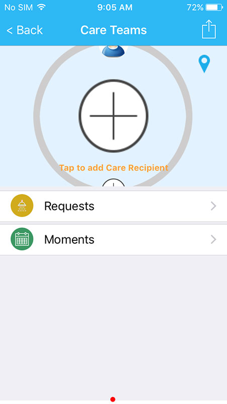 Care Team section allows users to set care team for themselves, including care recipient, physician, nurse, or caregiver, along with their location.