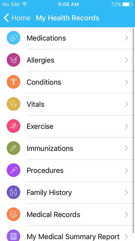 My Health Records section contains main features of the app, which are mostly trackers, including medication tracker, vitals, activity, and so on.