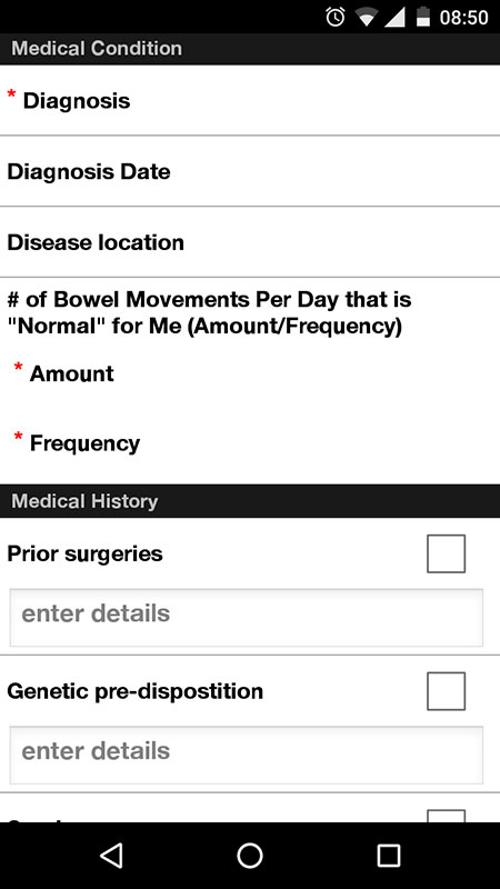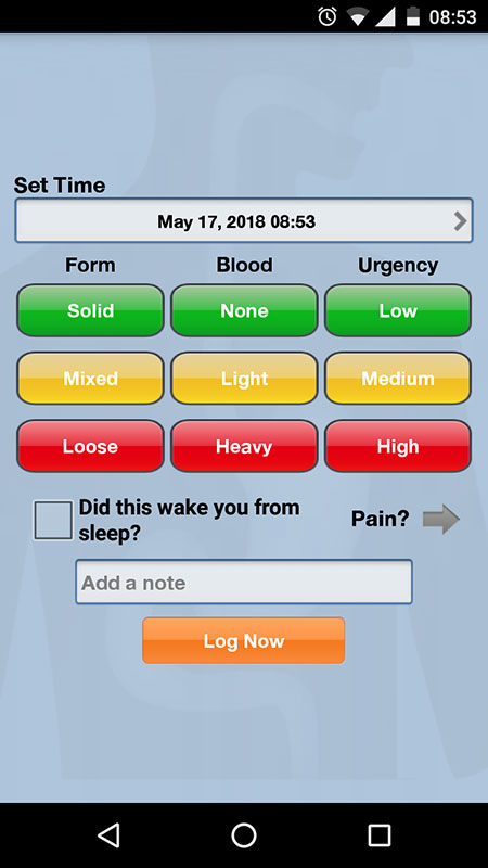 To track bowel movements, users can set time (it can be set retroactively which is good), a form of their BM, an appearance of blood in their BM, and urgency. Users can additionally state if the BM woke them from their sleep and if there was a pain, which takes the users to pain level log.