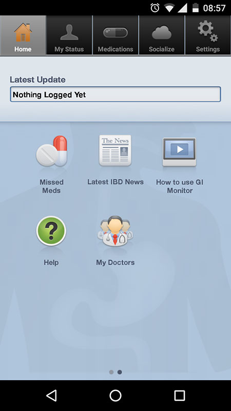 Users can swipe left to the second page containing additional sections that patients can use to log missed medications, view latest IBD news, list their doctors, or view help on how to use the app.