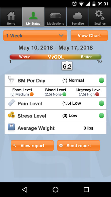My Status tab allows users to review their logs for a particular day, week, month, and so on. It is basically the app's custom Quality-of-Life scale, which uses factors like stool number, form, blood, and urgency levels as well as pain and stress levels to calculate the quality of life on a 1-10 scale.