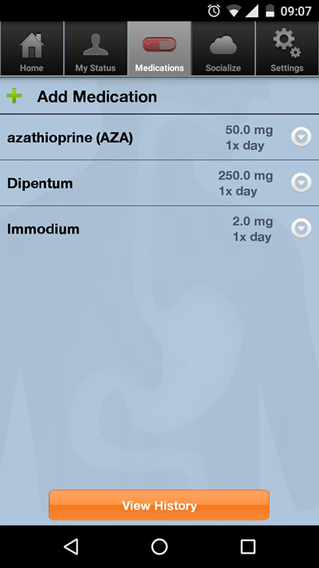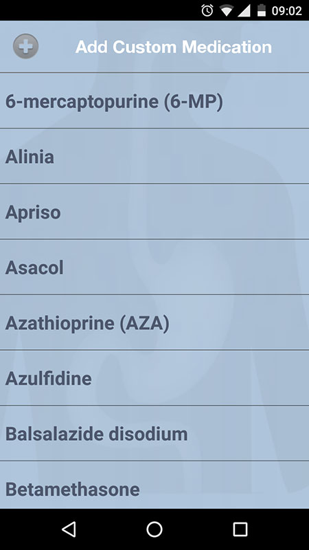 The Medications section allows users to add medication they use from the list of drugs used to treat IBD symptoms, such as anti-inflammatory drugs, immunosuppressants, anti-diarrheal medications, and so on. I couldn't notice antibiotics or pain relievers on this list.
