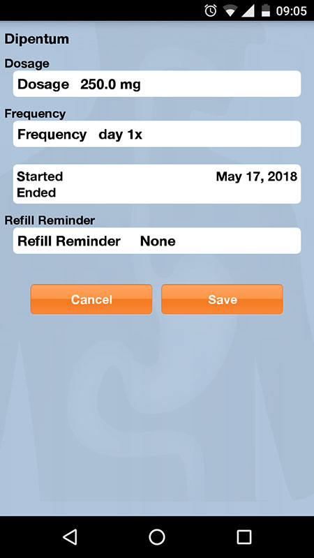 Patients can set the dosage, frequency, start and end date, and refill reminders. However, the app doesn't allow users to set reminders for medication use, which is a shame.