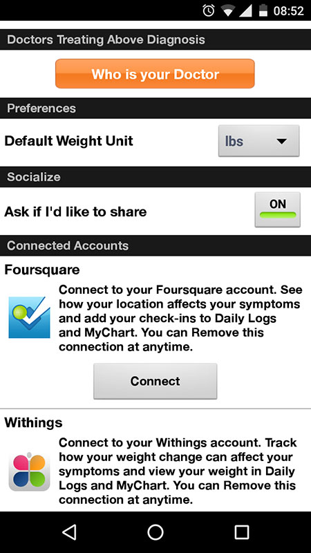 Here, in Settings, users can also choose to connect GI Monitor app to Foursquare account to see how location affects their symptoms.
