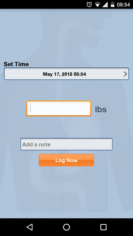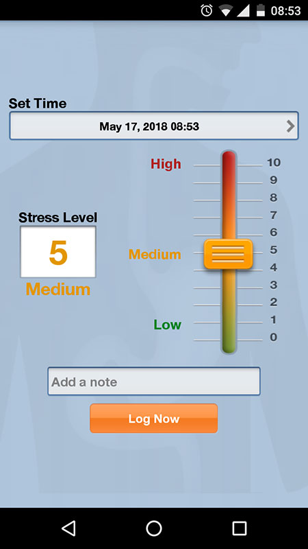 Patients can log their pain and stress level in a similar manner by setting time and choosing from 0-10 scale, indicating pain levels from non-existing to highest.