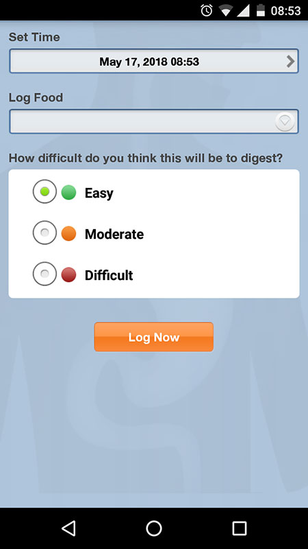 Users can also log their meals by adding food and choosing one of three choices to indicate how difficult the food will be to digest.