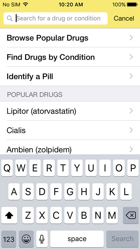 The app's interface differs from the version for doctors, but it's still simple and straightforward. It features the search field that users can utilize to search for drugs by name or by the condition. You can start typing the name of the drug and let the autocomplete populate the list as you type.