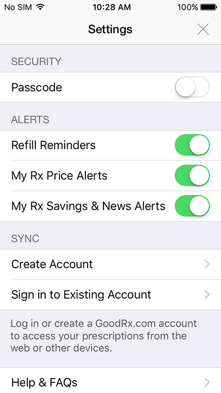 Also, the app sends price and saving alerts, as well as refill reminders that can be turned on/off in the app Settings menu. Users can also set a 4-digit Passcode or TouchID to protect their prescription information.