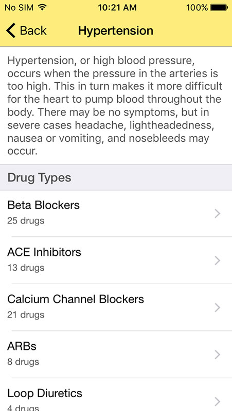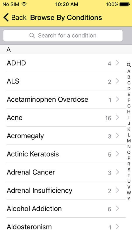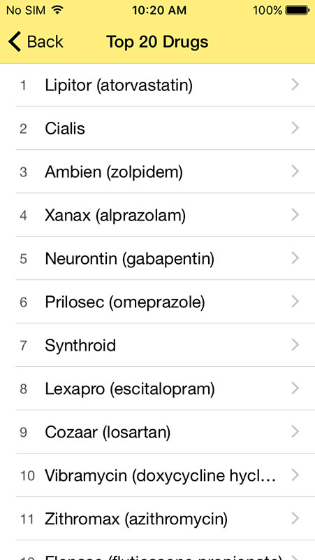 Other options to search for drugs is by browsing popular drugs in the Top 20 list, or medical conditions listed alphabetically. Each condition is briefly explained, as well as the type of medications used to treat it. Also, the app provides detailed information for each medication listed, including dosing, precautions, drug interactions, side effects, commonly used brand names, and so on.