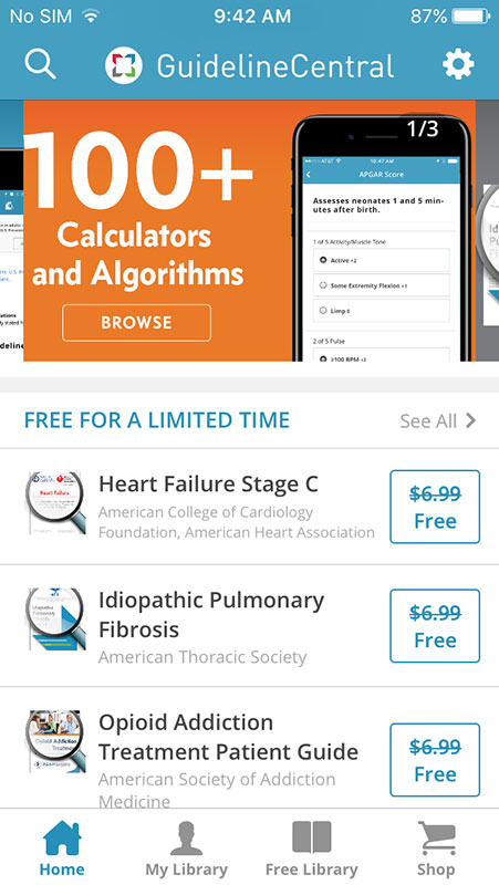 After completing the registration, the Guideline Central app opens to the Home screen that features selection of guidelines. First there are guidelines that are free for limited time, followed by guidelines for your specialty, as well as the new and most popular summaries.