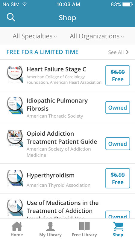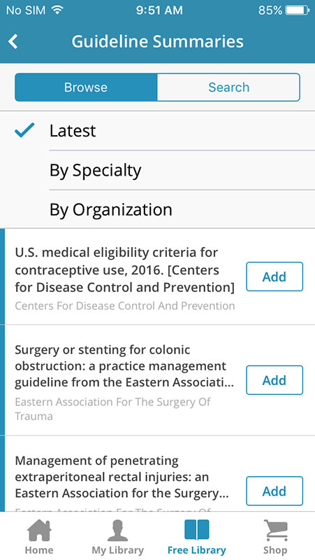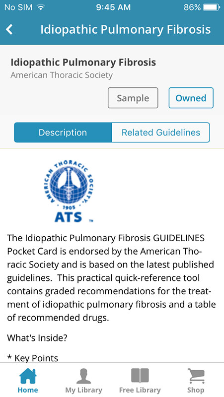 To download any guideline, simply tap on Free (or price) beside the Sample button. Once the guideline is downloaded, the button will be changed into Owned, indicating that the full guideline is now available to you. All downloaded guidelines will be listed in My Library section in the footer, allowing you to quickly access the guidelines for which you have paid to subscribe or you have downloaded for free.