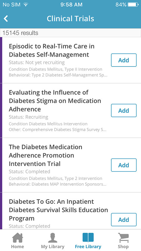 Next section, Clinical Trials features a database of publicly and privately supported clinical studies worldwide. You can simply search for condition, or use advanced search options to filter the results by recruitment type, study results, study type, country, etc.