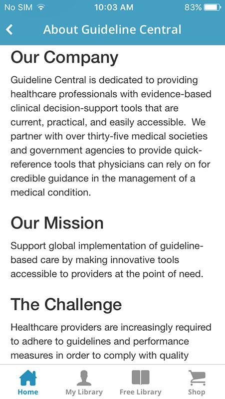 Other than these occasional issues, the Guidelines Central app is really easy to use by navigating through its sections or by using the search from the home screen. It provides medical providers with access to a large database of frequently updated guidelines and summaries, which are current, credible and evidence-based. This makes this app a very useful tool for daily clinical practice.