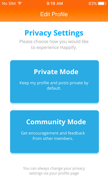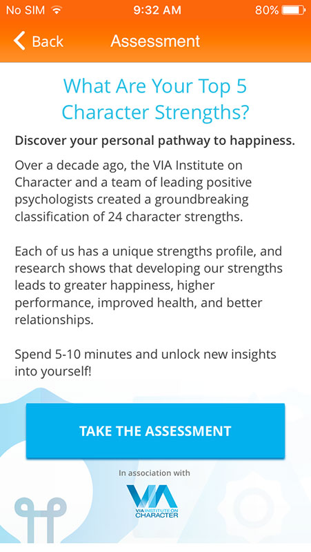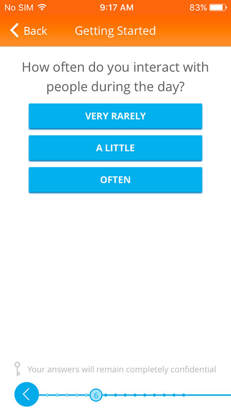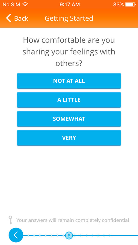 Before setting up an account the users are taken through the survey that will help the app design a personalized track for each user beneficial for their individual journey to happier life.