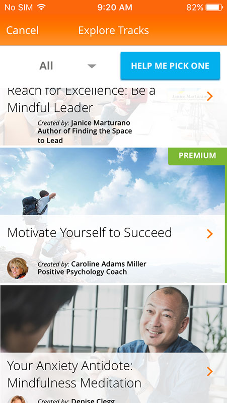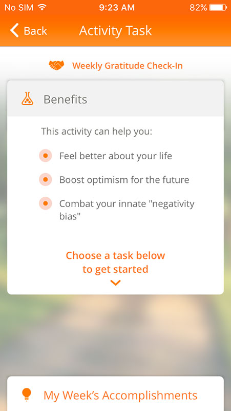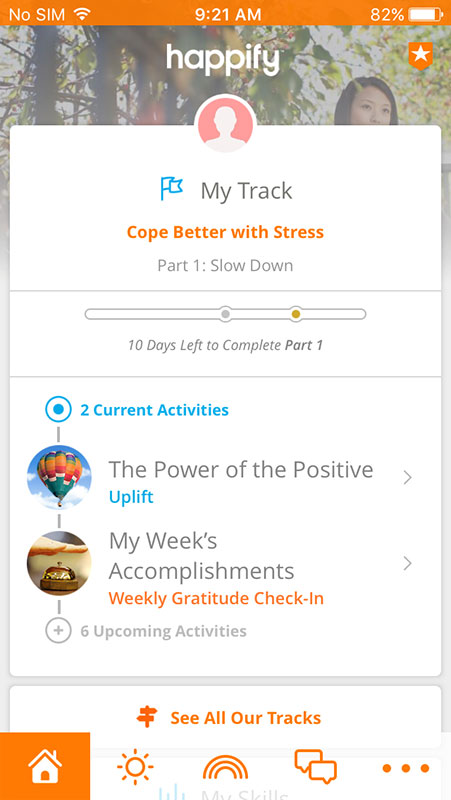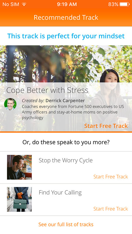 Based on the answers I provided in the survey, the app created the first track for me named Cope Better with Stress. The part 1 of this track was named Slow Down and I got 10 days to complete it. There were two current activities The Power of the Positive Thinking and My Week's Accomplishments, and six more activities to come (not sure if after buying subscription).