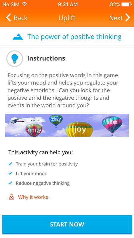 The Power of the Positive Thinking basically features games that are supposed to train your brain for positivity, lift your mood and reduce negative thinking. Users listen to soothing music, while hot air balloons fly around the screen, with various words appearing on them.