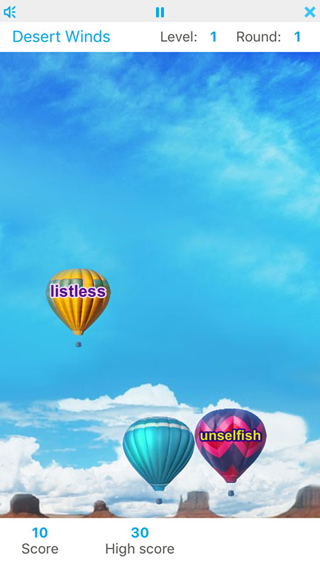 The object of the game is to get as many points as possible by tapping on the balloons when positive words appear and ignoring the negative words. Tapping on balloons with positive words will eventually chase them away off the screen, which completes the round.