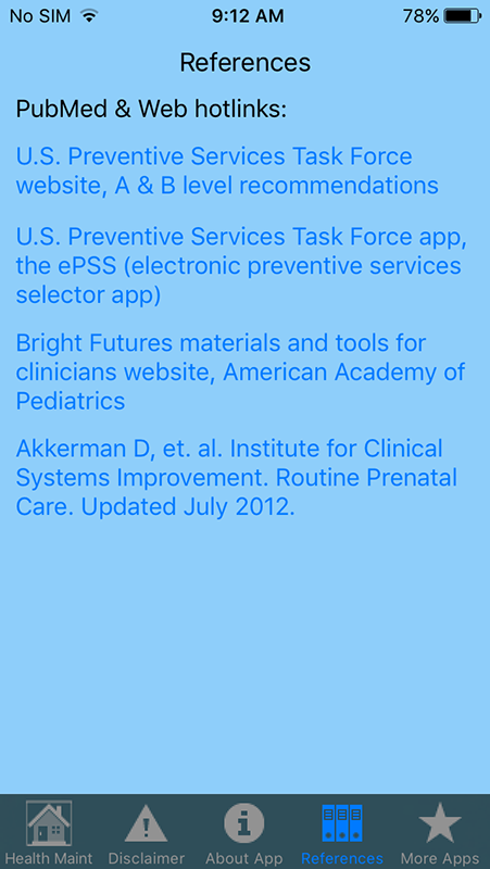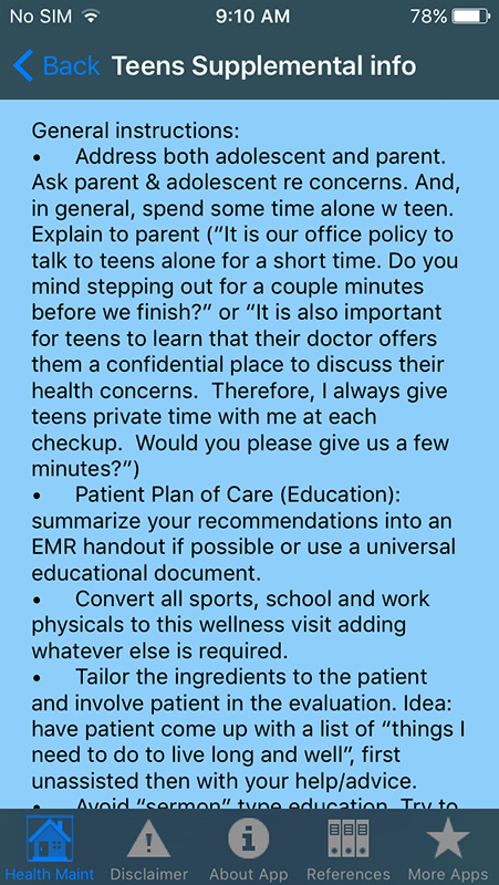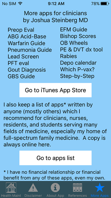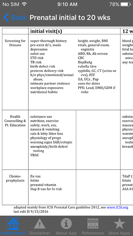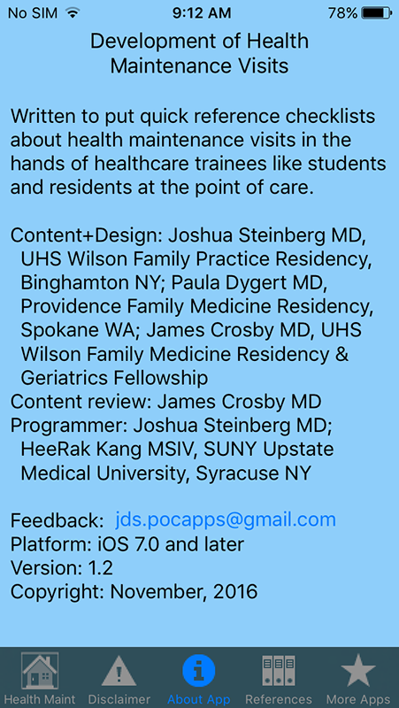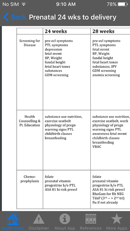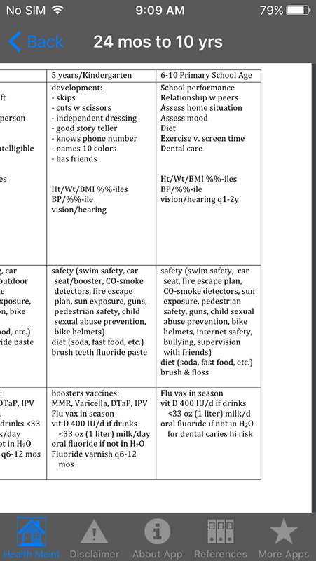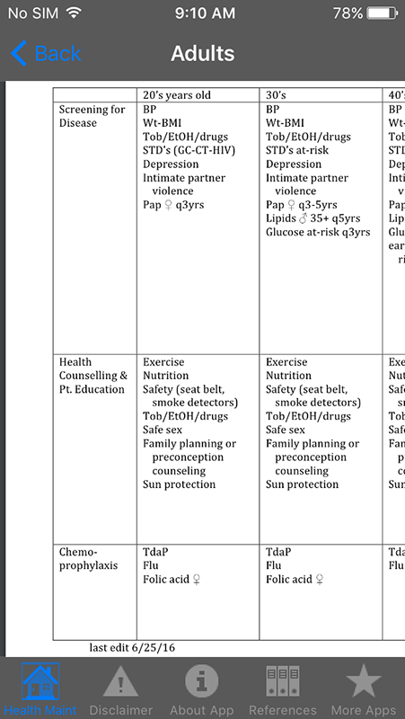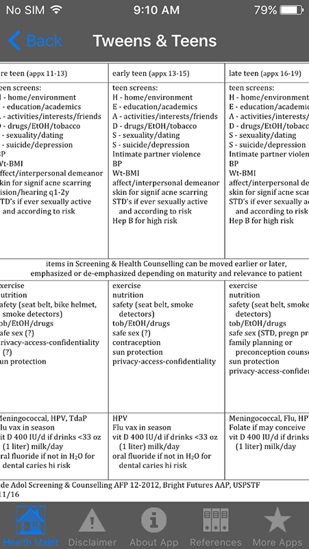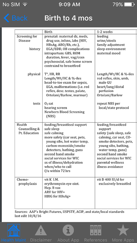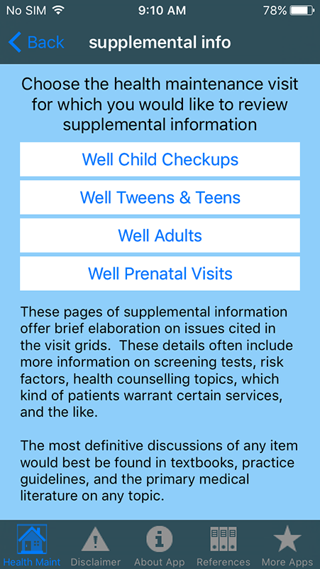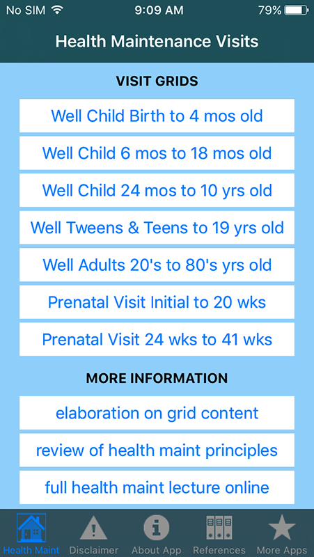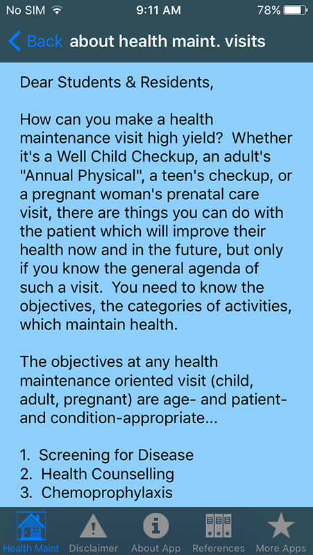 Despite its simple interface and "unimpressive design", Health Maintenance Visit Checklists is very useful app for primary care residents and students on rotations in primary care or family medicine, mostly because it gathers all the exhaustive information in one place, which other similar apps may be lacking.