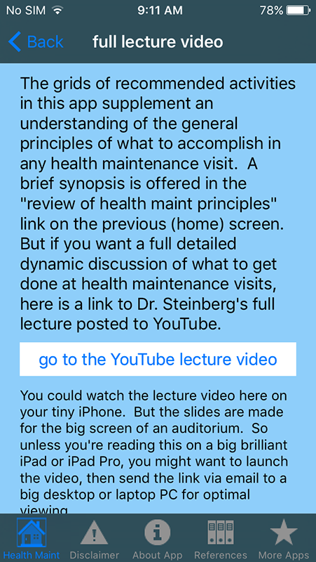 He also included an online video lecture, which offers a full detailed dynamic discussion of what to get done at health maintenance visits. Both written principles and online lecture have great educational value.