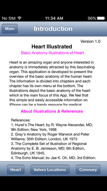 The Heart Illustrated app opens to a simple page featuring 5 sections, which include Introduction, explaining the app, illustrations, and references used, and 4 heart anatomy sections, including Coronary Circulation, Chamber Anatomy, Cardiac Valves, and Conduction System.