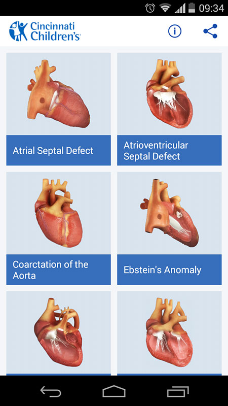 For the purpose of better visualization and explanation of CHD and correction methods, Cincinnati Children's Hospital created Heartpedia app, which allows users to interact with 3D models of pediatric heart anomalies and defects. Medical providers may use these anatomically correct models as a visual learning tool to help educate patients and families on specific defects and repairs. The patients and families, who want to learn more on their own, or to share the details of a defect with concerned friends and family, may find Heartpedia app useful as well.