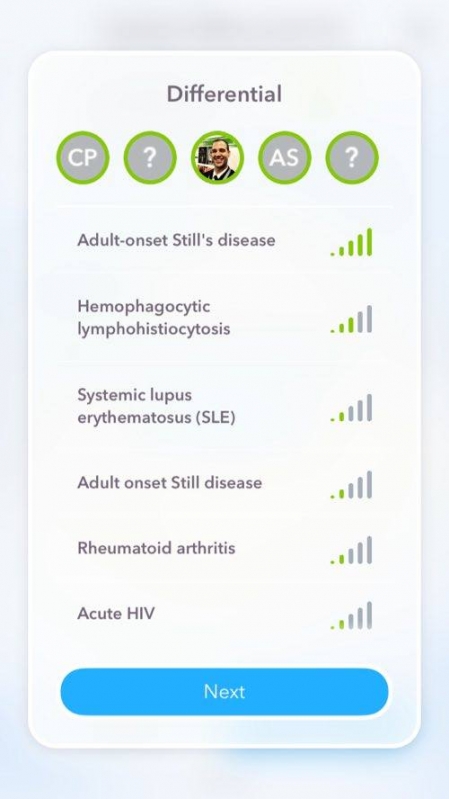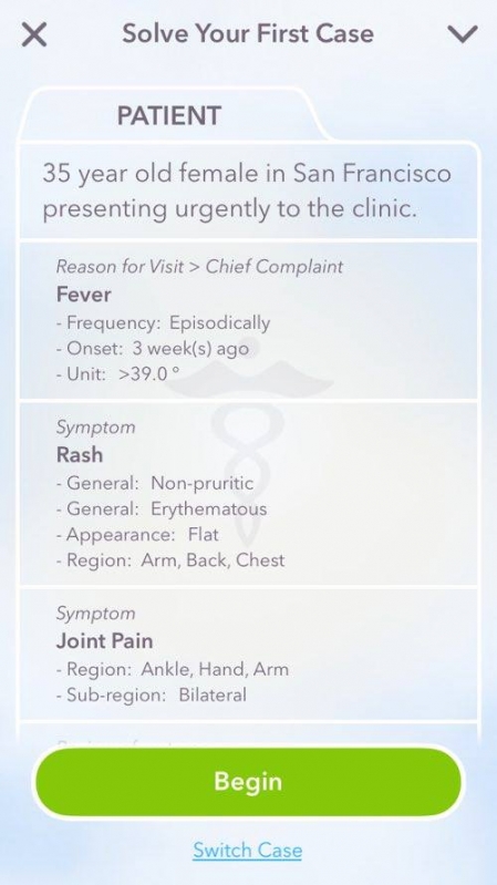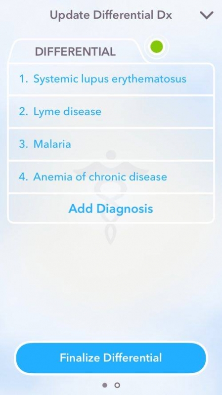 If you choose to solve cases, you will be directed to a basic prompt and then open a page describing the chief complaint and pertinent findings from the physical examination. After reading through the case, a user is asked to start building their differential diagnoses in order to learn more information about the case. After inputting a few differentials, key lab results are reveals to help you narrow down your differentials or correct them based on new findings.