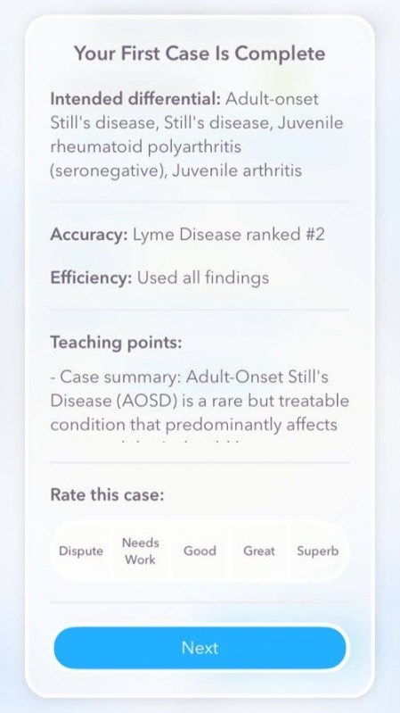 Once you work through the case, you submit your finalized differential diagnoses and then receive a comprehensive breakdown of what other colleagues selected as common differentials based on the presenting information as well as how accurate your problem solving was.
