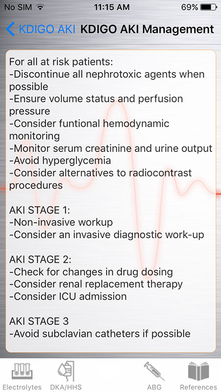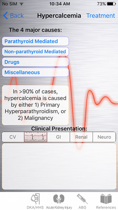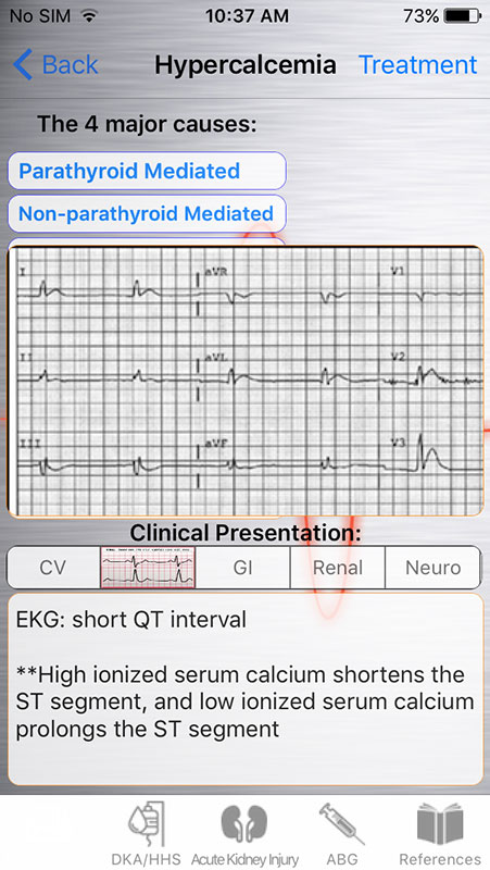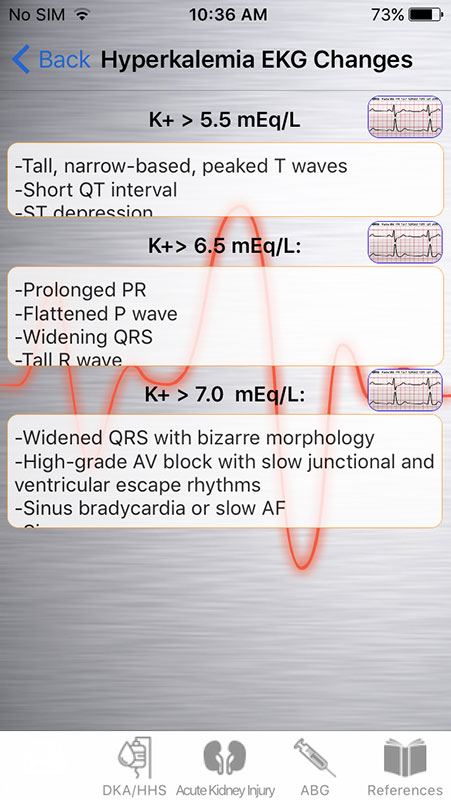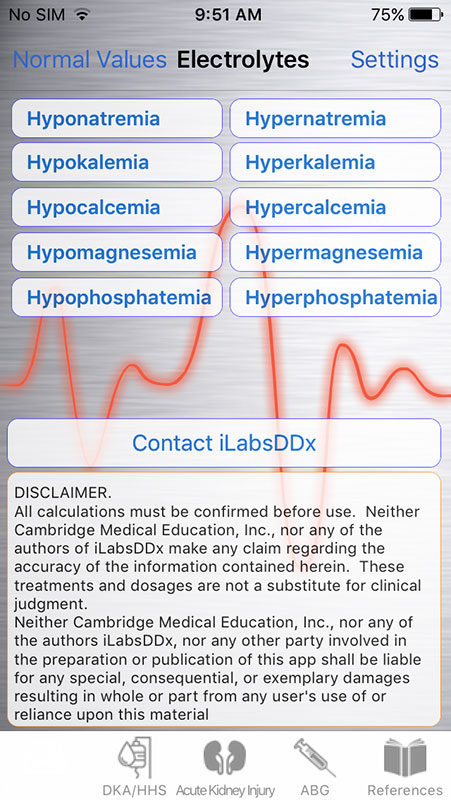 This is really good app, offering a variety of lab abnormalities, with multiple steps along the way that help users walk through the whole process of getting differential diagnosis. Including EKG charts is also a big plus; because these charts help providers visualize changes in CV presentations for different abnormalities.