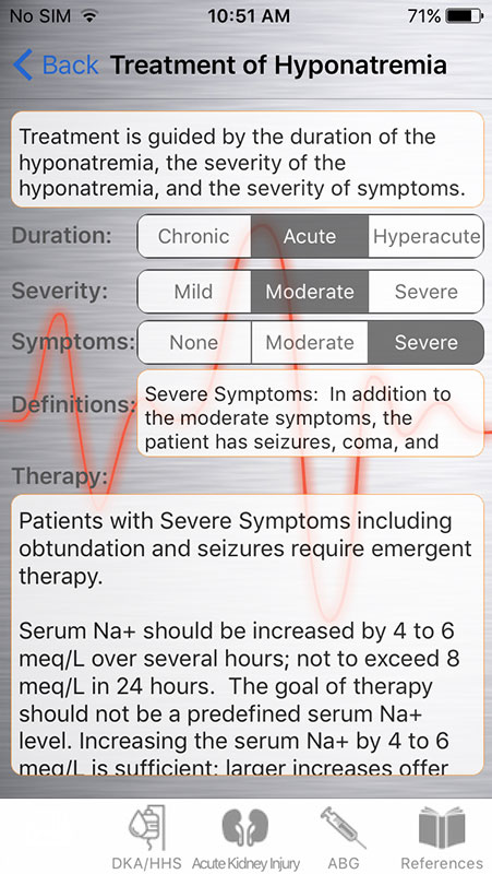 Each of the abnormalities also provides treatment suggestions. Some of these suggestions will first require you to provide additional info about the electrolyte or your patient. For example, if you have patient with hyponatremia, you'd have to provide information about duration of the abnormality (chronic, acute or hyperacute), severity and symptoms, before getting treatment recommendations. It should be noted that the app offers some common guidelines, not the exact course of the treatment.