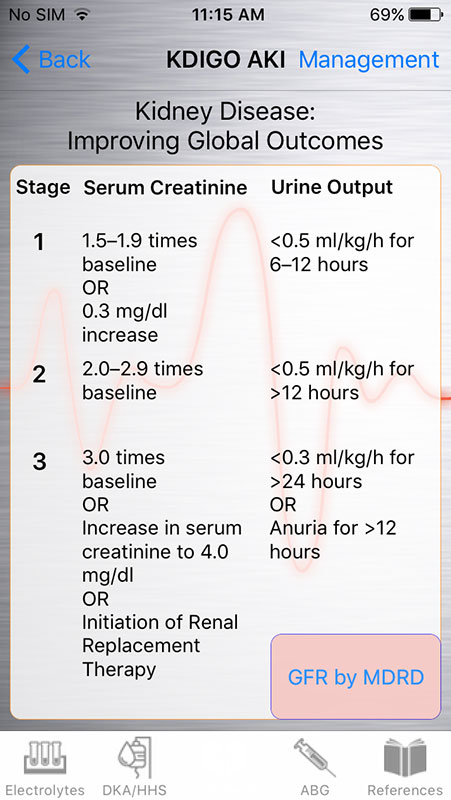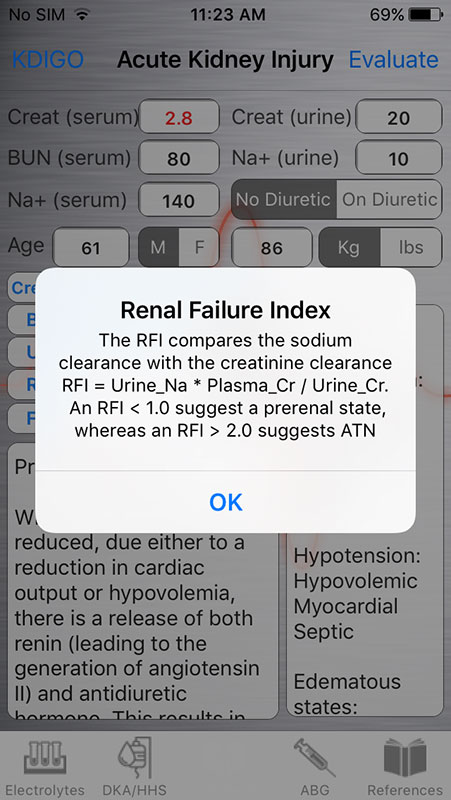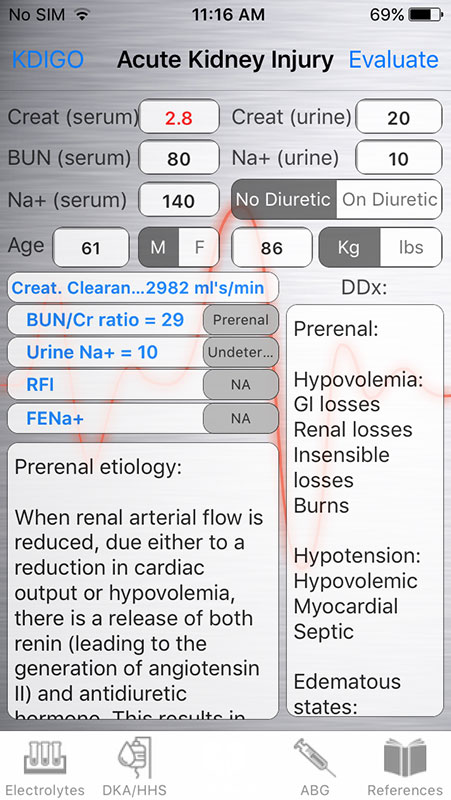Next option is Acute Kidney Injury, which is also a calculator, providing an algorithm for evaluation of the patient with acute kidney injury. It requires you to enter patient's values in urine and serum, i.e. elevated creatinine, BUN, and sodium. Also, you have to provide information if the patient is on diuretic or not, their age, sex and weight. After entering all necessary information, you'll get the evaluation of the differential diagnosis, providing suggestions based on the values you've entered, along with KDIGO guidelines for acute kidney injury management.