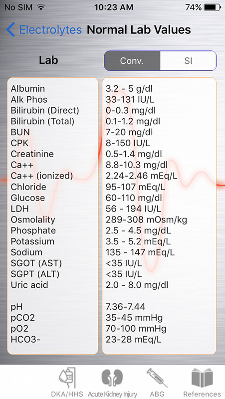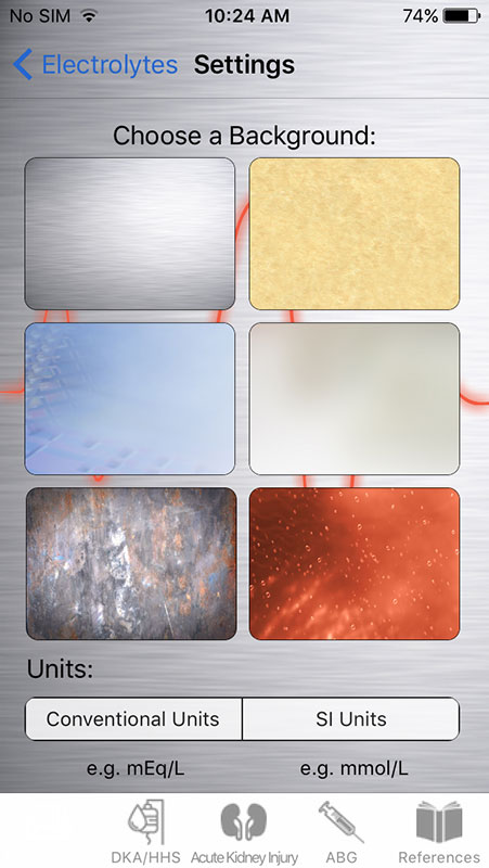 Completing the registration part opens the home screen which is basically the list of electrolytes, i.e. the most common abnormalities. There are also two more screens. First with normal lab values you could use as a reference, and the Settings, which basically gives you just an option to change app background and pick between units (conventional and SI).