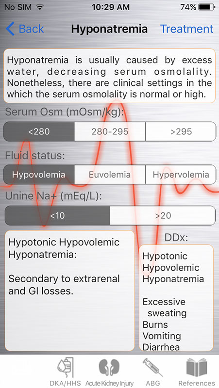 Tapping on any of these conditions, opens a new screen. For example if you've chosen hyponatremia, you'd get the screen with abnormality description, as well as options to enter additional values, such as Serum Osm, fluid status (whether it's hypovolemic, euvolemic or hypervolemic) and Unine Na+, in case of hyponatremia. Upon entering the values you'd get differential diagnosis (DDx).