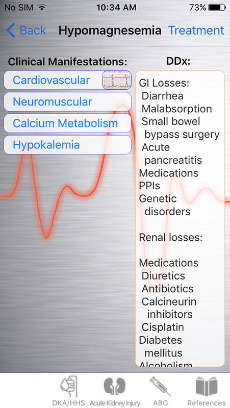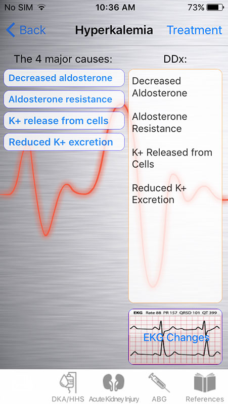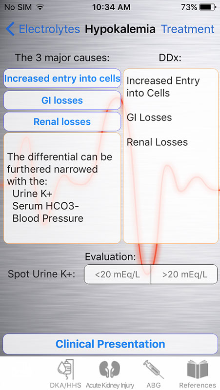 Each of the electrolytes abnormalities has different options and offers different DDx, depending on the abnormality type. For example, for hyperkalemia you can check 4 major causes, get description and differential diagnosis for each, as well as EKG changes depending on values.