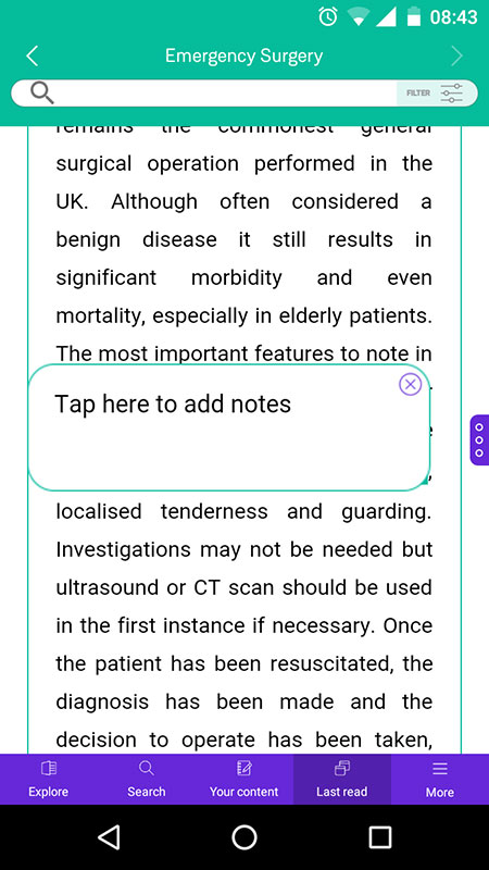 Favorites (bookmarks) and notes could be found in the 'Your content' section along with downloaded books. There's also the 'Last read' section allowing users to jump straight to the most recently opened and read book.