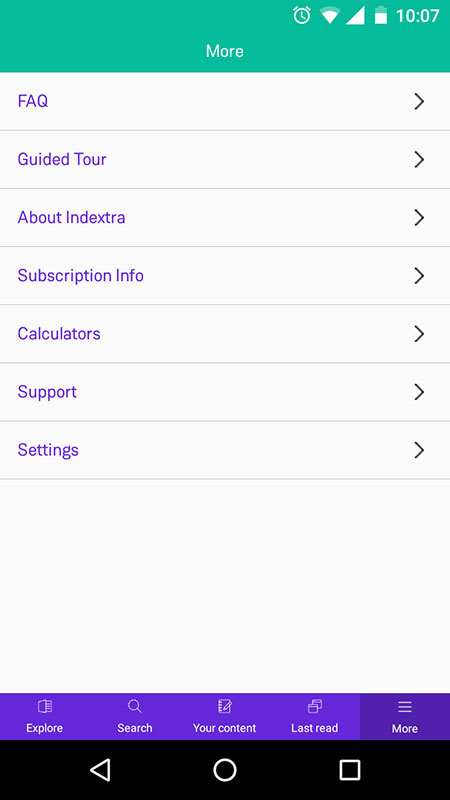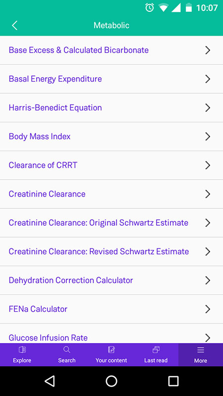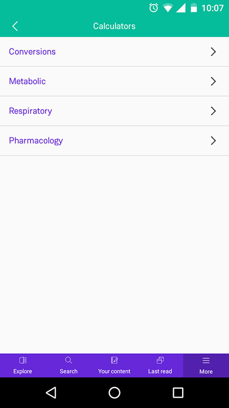 Besides textbooks and guidelines, the Indextra app also includes a number of built-in medical calculators that can be found in the 'More' section. There are four categories of calculators including Conversions, Metabolic, Respiratory, and Pharmacology.
