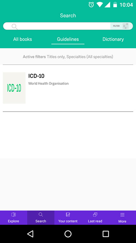 There is a 'Search' feature that users can utilize to look up for particular medical terms within all books at once. Users can also search all available guidelines (currently only one ICD-10 guideline), as well as a medical dictionary.