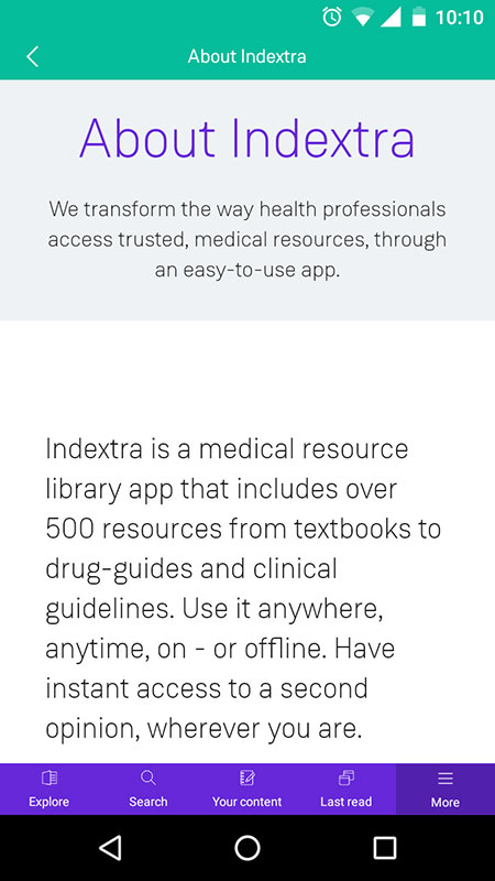 The Indextra is an impressive app that provides an online and offline access to more than 500 up-to-date medical textbooks and guidelines from the leading medical publishers tailored for all specialties.