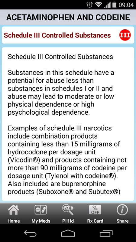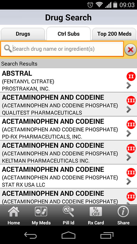 It should be noted that app also lists controlled substances separately, with schedules from I to V, indicating their potential for abuse (the lower the number, i.e I or II, the higher the risk).