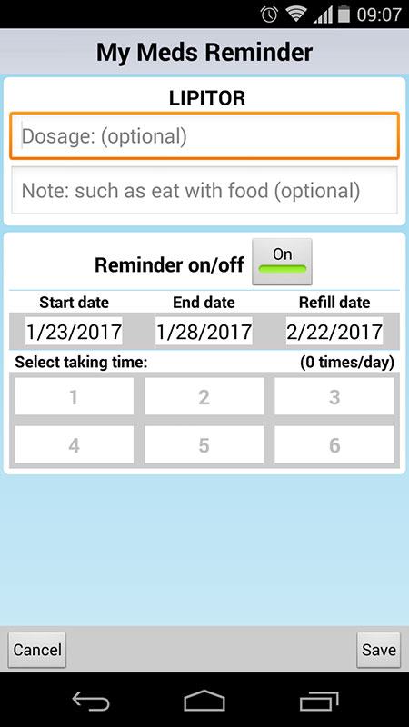 As you've added the drug(s), you can set reminders, including dosage, start, end, and refill date, how many times a day you should take it, and additional notes.