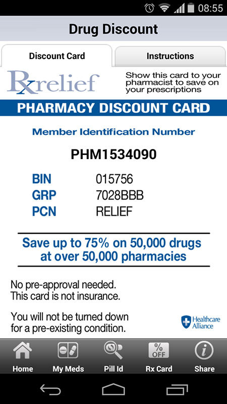 The app opens to a main screen that features several different options including My Meds Reminder, Discount Card, Pill identifier, Drug Search, and others. Most of these options are made for patients, while some of them, particularly drug search and pill identifier, can be used by providers as well.