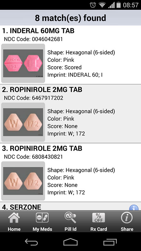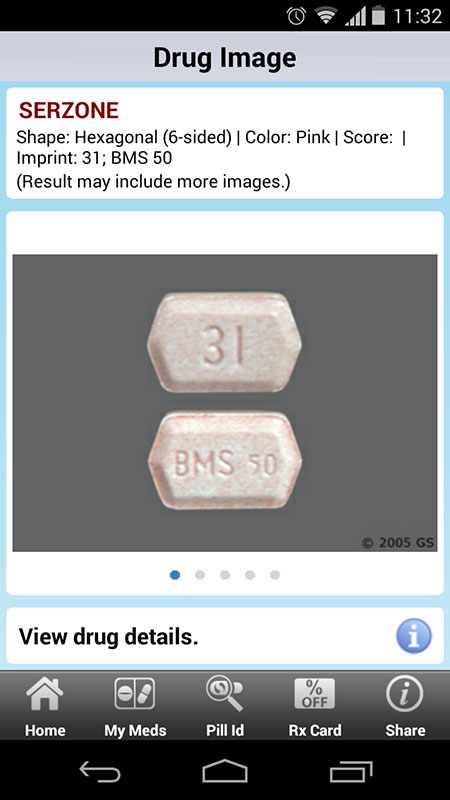 Most of the drugs listed have Info button that allows users to get additional information, i.e. pictures with all shapes and colors for the chosen drug (if made by different manufacturers) and more information, which you can also get via Drug Search option.
