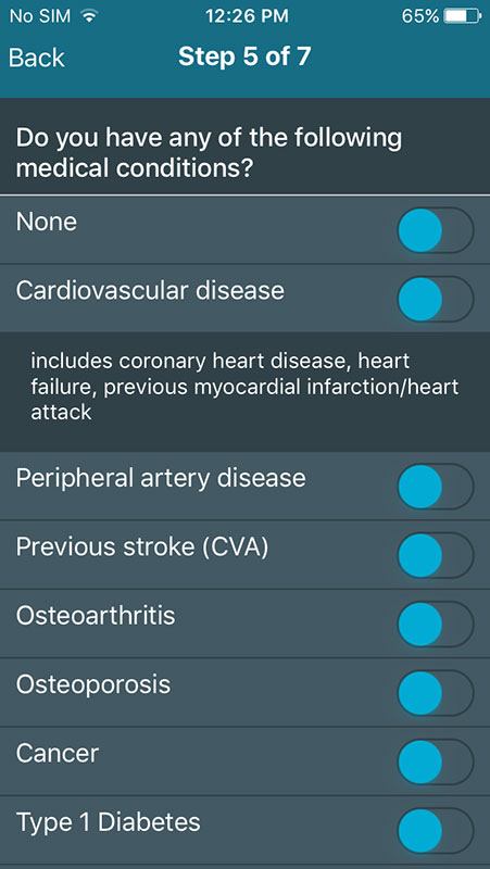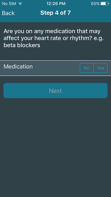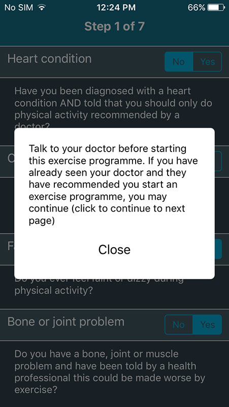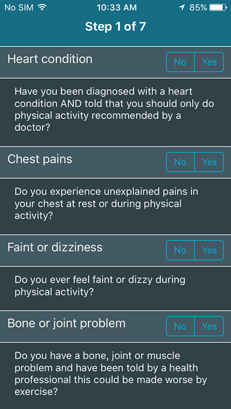 After finishing the tour and tapping on the button to start the app, you will be taken through a medical screening questionnaire, which is based on the PAR-Q, or Physical Activity Readiness Questionnaire, by Canadian Society for Exercise Physiology, and the Adult Pre-exercise Screening Tool by Exercise and Sport Science Australia. This questionnaire is medically validated and recommended by the American College of Sports Medicine.