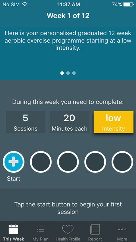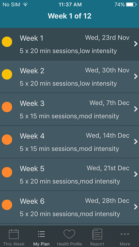 Upon providing all necessary information, you'll get your own personalized plan from Week 1 to Week 12. The plan starts at low intensity with 5 sessions lasting 20 minutes each, and after two initial weeks it gradually increases the intensity and session duration as you progress.