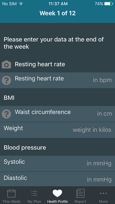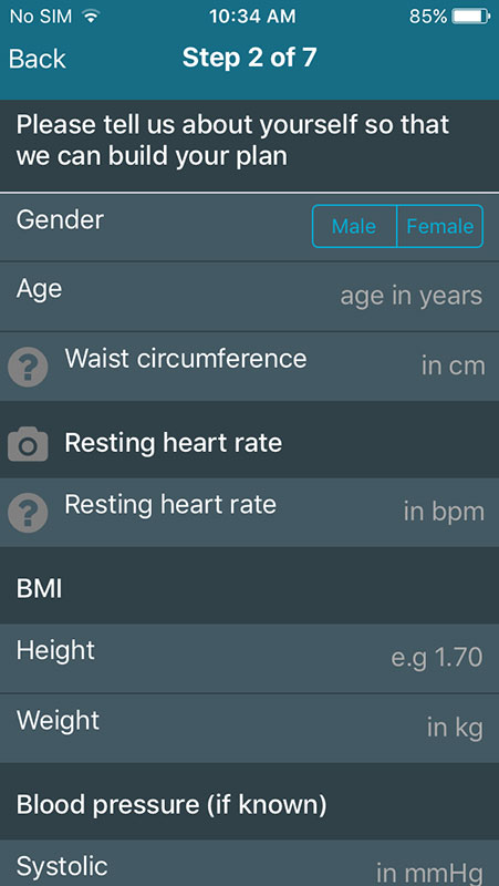 Second step requires you to enter some info about yourself, so the app can build a plan for you. The information you have to provide ranges from gender and age to your heart rate, BMI, waist circumference and blood pressure (if known).