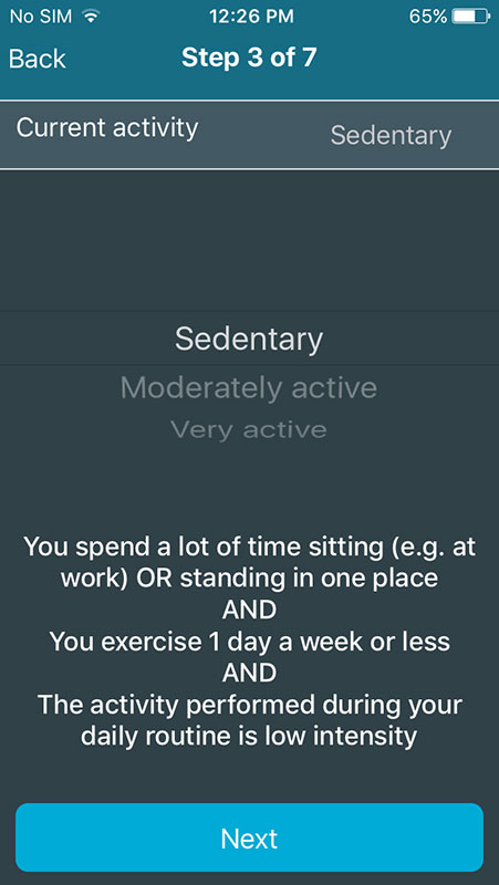 The third step requires you to enter your current activity level, asking you to choose between sedentary, moderately active and very active. For the purpose of this app, we've chosen sedentary. Step four asks if you're on any medications that may affect your heart rate or rhythm, such as beta blockers. Step five goes through the list of medical conditions, from cardiovascular disease, cancer, diabetes to COPD or MS, asking you to choose if you have any or none.