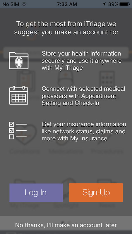 After opening the app, you'll have an option to create an account and have the app personalized. You'll also have an option to be taken through the tour that explains the app's main features and functionalities, i.e. how the symptom checker works, how to find right providers, how to access medical content, etc.