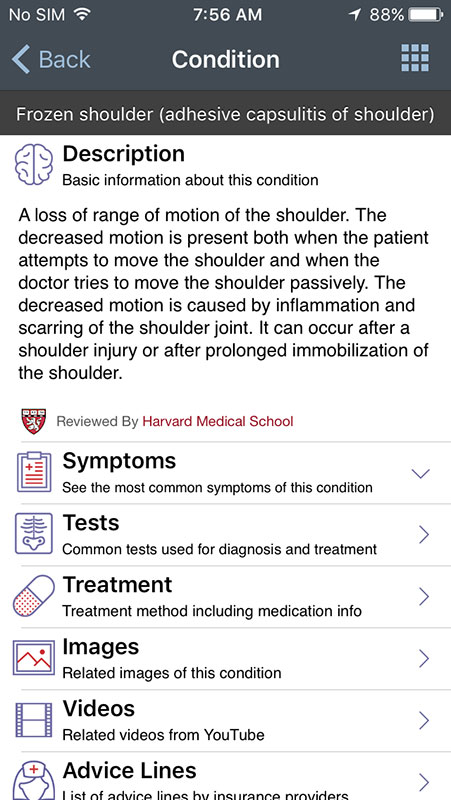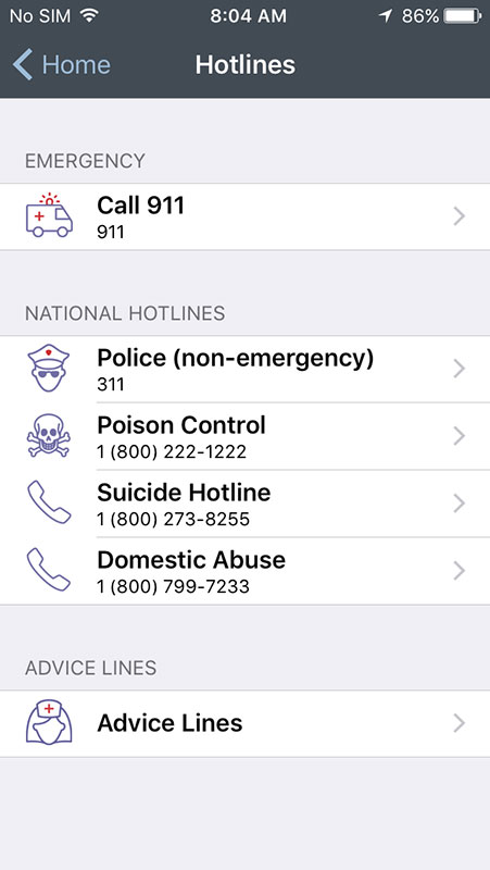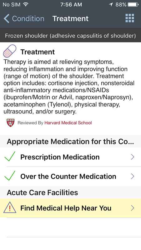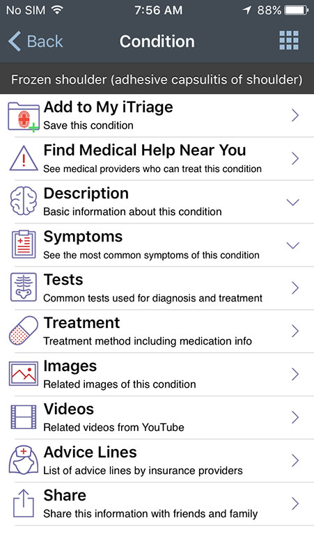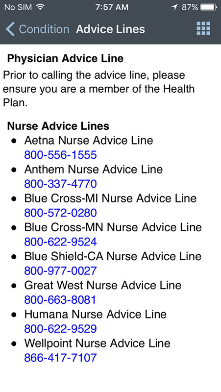 Condition page also allows users to find immediate medical help near their location, or to call advice lines by their insurance providers. All information can be added to the personalized page or shared with friends or family.