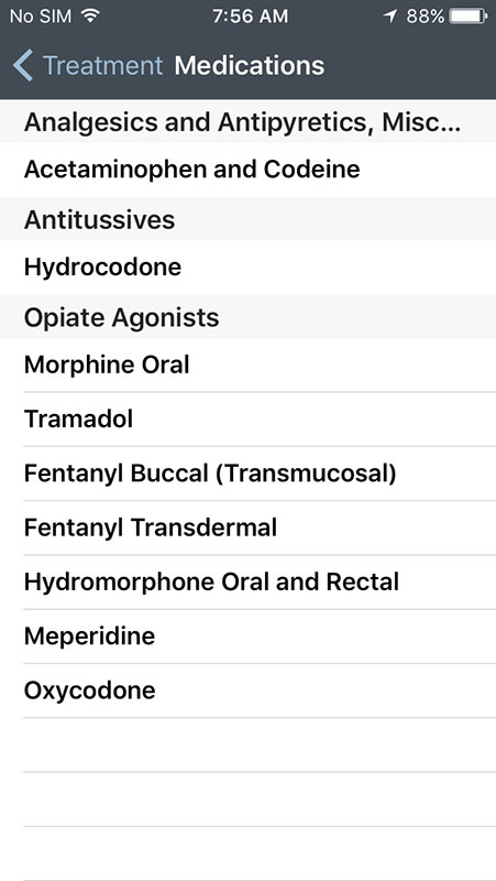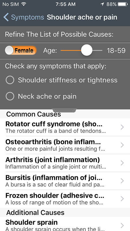 Tapping on the symptom will open the list of all potential causes that in some cases can be refined, by adding the age, gender or any major symptom.