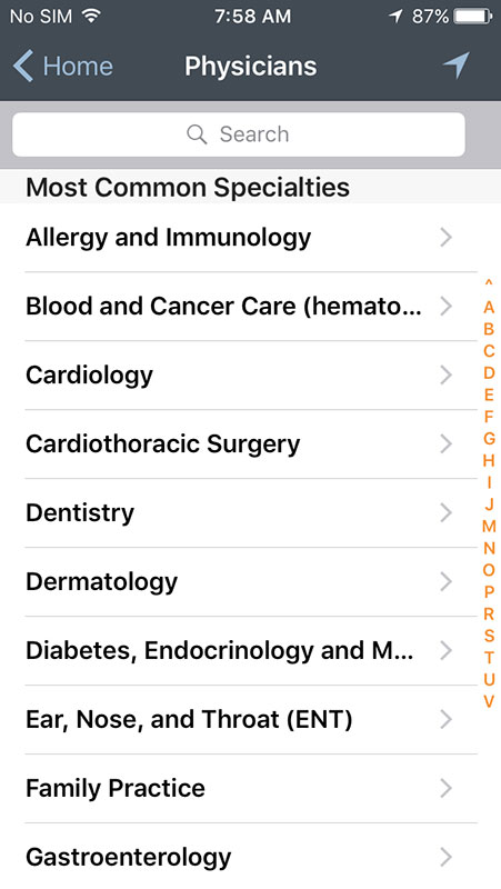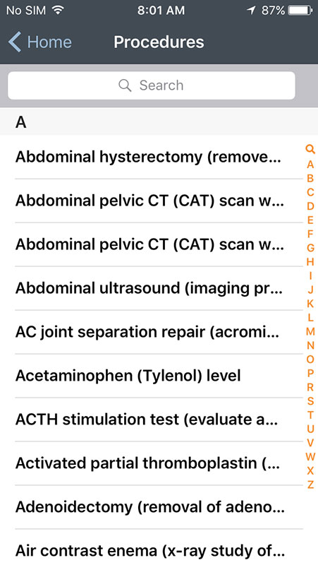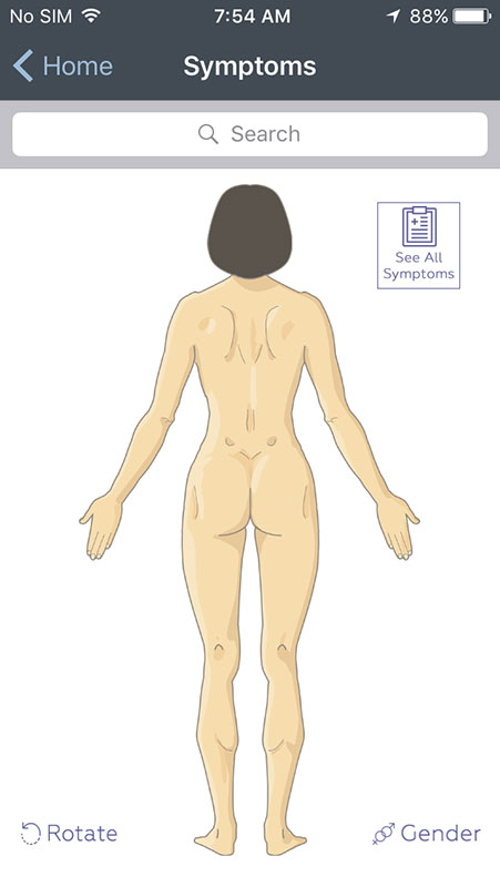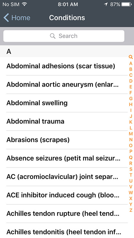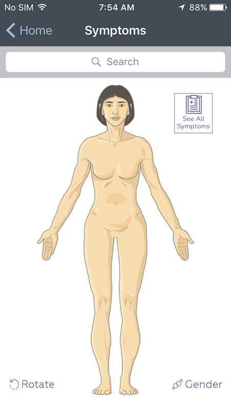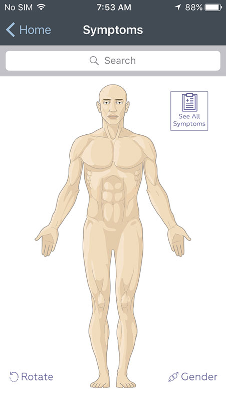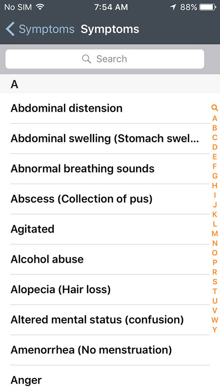 You can also choose to see all symptoms listed alphabetically, instead of interactive bodies. There are small letter on the right that may help you with the navigation, but they're too small to be used conveniently. Instead, there's a search option built in the app that works well and fast, allowing you to find what you're looking for with a great accuracy.
